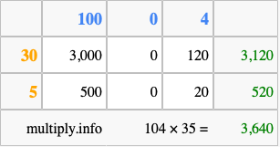 Below is an illustration showing you how to calculate 104 times 35 using the box method, using the instructions above.