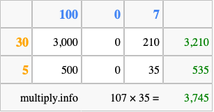 Below is an illustration showing you how to calculate 107 times 35 using the box method, using the instructions above.