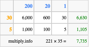Below is an illustration showing you how to calculate 221 times 35 using the box method, using the instructions above.