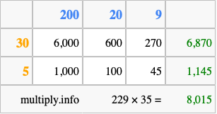 Below is an illustration showing you how to calculate 229 times 35 using the box method, using the instructions above.