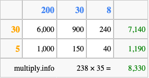 That's all there is to it! As you can see from the box above, the answer to 238 times 35 using the box method is 8,330.