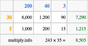 Below is an illustration showing you how to calculate 243 times 35 using the box method, using the instructions above.