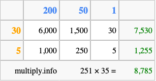 That's all there is to it! As you can see from the box above, the answer to 251 times 35 using the box method is 8,785.
