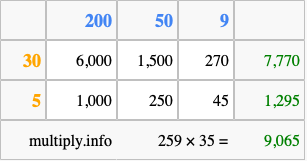 Finally, we add up all the sums we found in step 3 to get our final answer to 259 times 35.