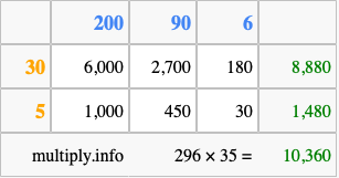Below is an illustration showing you how to calculate 296 times 35 using the box method, using the instructions above.