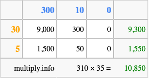 Below is an illustration showing you how to calculate 310 times 35 using the box method, using the instructions above.