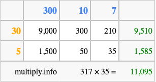 Below is an illustration showing you how to calculate 317 times 35 using the box method, using the instructions above.