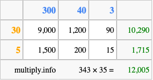 Finally, we add up all the sums we found in step 3 to get our final answer to 343 times 35.