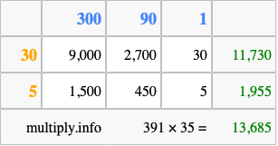 Below is an illustration showing you how to calculate 391 times 35 using the box method, using the instructions above.