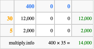 That's all there is to it! As you can see from the box above, the answer to 400 times 35 using the box method is 14,000.