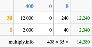 Finally, we add up all the sums we found in step 3 to get our final answer to 408 times 35.