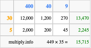 Finally, we add up all the sums we found in step 3 to get our final answer to 449 times 35.