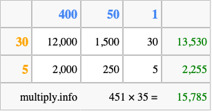 Finally, we add up all the sums we found in step 3 to get our final answer to 451 times 35.
