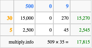 Finally, we add up all the sums we found in step 3 to get our final answer to 509 times 35.