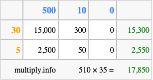 Below is an illustration showing you how to calculate 510 times 35 using the box method, using the instructions above.