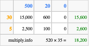 Below is an illustration showing you how to calculate 520 times 35 using the box method, using the instructions above.