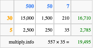 Finally, we add up all the sums we found in step 3 to get our final answer to 557 times 35.