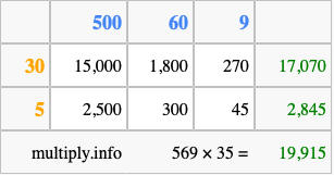 Below is an illustration showing you how to calculate 569 times 35 using the box method, using the instructions above.
