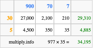 Below is an illustration showing you how to calculate 977 times 35 using the box method, using the instructions above.