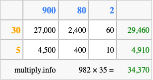 Below is an illustration showing you how to calculate 982 times 35 using the box method, using the instructions above.