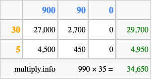 Finally, we add up all the sums we found in step 3 to get our final answer to 990 times 35.