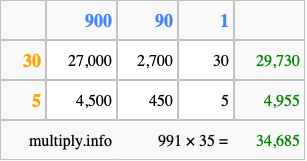 Below is an illustration showing you how to calculate 991 times 35 using the box method, using the instructions above.