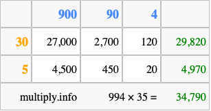 Below is an illustration showing you how to calculate 994 times 35 using the box method, using the instructions above.