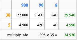 Below is an illustration showing you how to calculate 998 times 35 using the box method, using the instructions above.