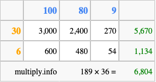 That's all there is to it! As you can see from the box above, the answer to 189 times 36 using the box method is 6,804.