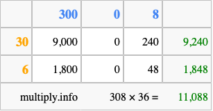 Below is an illustration showing you how to calculate 308 times 36 using the box method, using the instructions above.