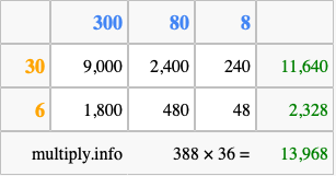 That's all there is to it! As you can see from the box above, the answer to 388 times 36 using the box method is 13,968.