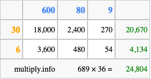 Finally, we add up all the sums we found in step 3 to get our final answer to 689 times 36.