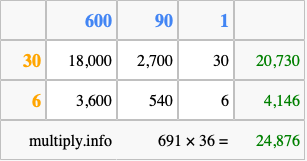 Finally, we add up all the sums we found in step 3 to get our final answer to 691 times 36.