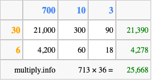 That's all there is to it! As you can see from the box above, the answer to 713 times 36 using the box method is 25,668.