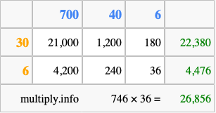 Finally, we add up all the sums we found in step 3 to get our final answer to 746 times 36.