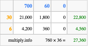 Finally, we add up all the sums we found in step 3 to get our final answer to 760 times 36.