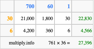 Below is an illustration showing you how to calculate 761 times 36 using the box method, using the instructions above.