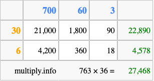 Finally, we add up all the sums we found in step 3 to get our final answer to 763 times 36.