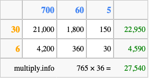 Finally, we add up all the sums we found in step 3 to get our final answer to 765 times 36.