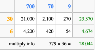 Below is an illustration showing you how to calculate 779 times 36 using the box method, using the instructions above.