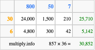 Below is an illustration showing you how to calculate 857 times 36 using the box method, using the instructions above.