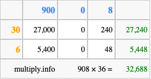 That's all there is to it! As you can see from the box above, the answer to 908 times 36 using the box method is 32,688.