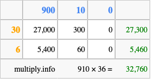 That's all there is to it! As you can see from the box above, the answer to 910 times 36 using the box method is 32,760.