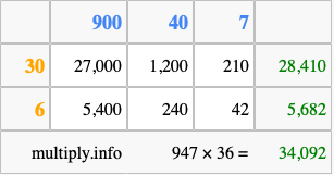 That's all there is to it! As you can see from the box above, the answer to 947 times 36 using the box method is 34,092.