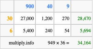That's all there is to it! As you can see from the box above, the answer to 949 times 36 using the box method is 34,164.