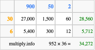 That's all there is to it! As you can see from the box above, the answer to 952 times 36 using the box method is 34,272.