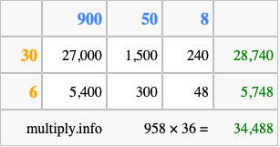That's all there is to it! As you can see from the box above, the answer to 958 times 36 using the box method is 34,488.