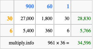 Below is an illustration showing you how to calculate 961 times 36 using the box method, using the instructions above.