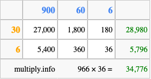 That's all there is to it! As you can see from the box above, the answer to 966 times 36 using the box method is 34,776.