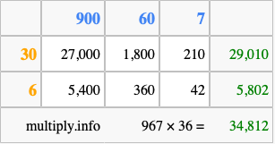 Below is an illustration showing you how to calculate 967 times 36 using the box method, using the instructions above.